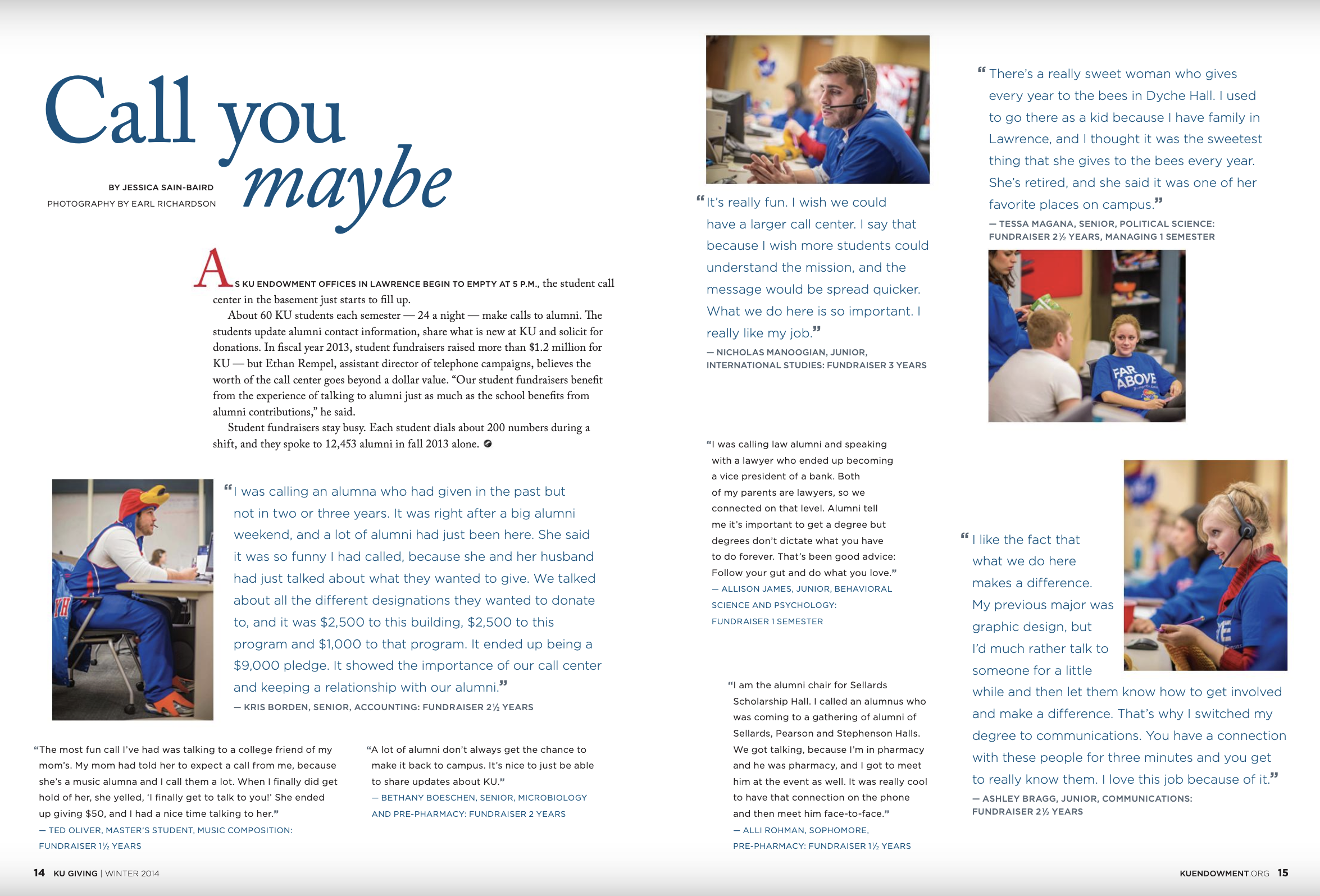 In the below example, I profiled the KU students who solicit alumni for donations — humanizing their job and sharing the unique stories behind some gifts.